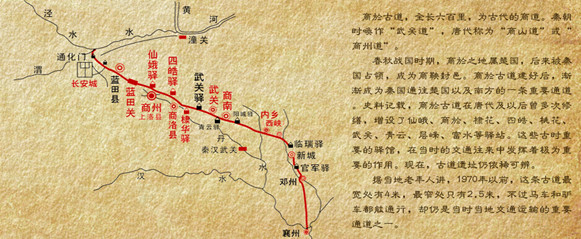商於古道,為古代的軍事、政治、商賈之道,其歷史可追溯到春秋戰(zhàn)國(guó)時(shí)期。該古道由陜西省商洛市(古時(shí)亦稱上洛郡、上洛侯國(guó)、洛州、“商州”)通往河南省內(nèi)鄉(xiāng)縣柒於鎮(zhèn),全長(zhǎng)約六百里。