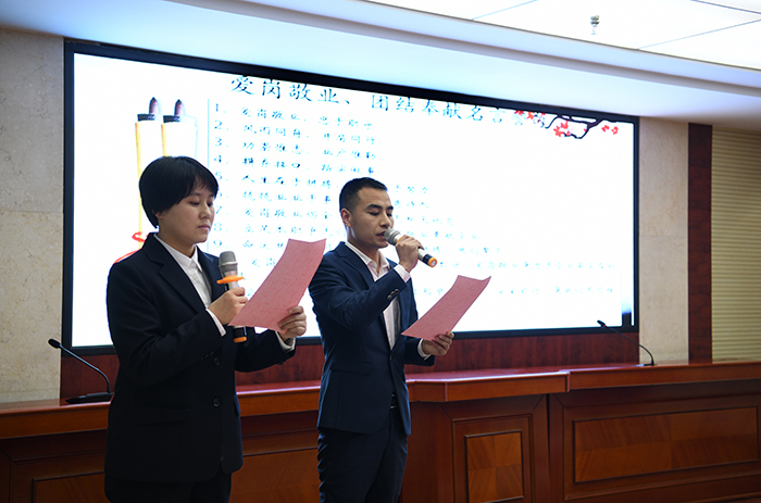 田力、陳瓊帶領(lǐng)全體員工誦讀"愛(ài)崗敬業(yè)、團(tuán)結(jié)奉獻(xiàn)"名言警句