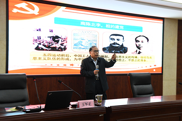 王軍正教授結(jié)合自己多年對黨史研究知識積累,結(jié)合豐富的史實(shí)、以特色鮮明的觀點(diǎn)和生動的語言陳述,從應(yīng)運(yùn)而生、開天辟地;波瀾壯闊、驚天動地;追夢圓夢、頂天立地三個方面,系統(tǒng)解讀了中國共產(chǎn)黨由誕生、發(fā)展、壯大到建立新中國,以及帶領(lǐng)全國人民建設(shè)小康社會百年艱苦卓絕的風(fēng)雨歷程。