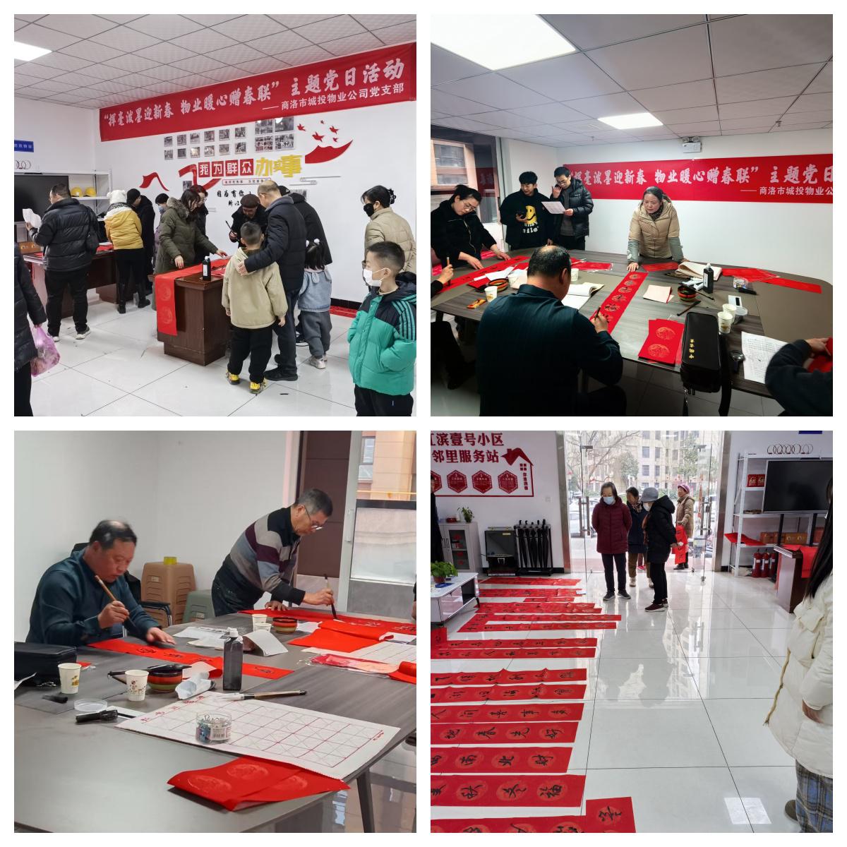三是開展“揮毫潑墨迎新春,物業(yè)暖心贈春聯(lián)”主題黨日活動?;顒蝇F(xiàn)場,為小區(qū)廣大業(yè)主們準備了精美的春聯(lián)禮包,書法家們揮毫潑墨,書寫新春對聯(lián),活動現(xiàn)場墨香四溢,氣氛熱烈,業(yè)主駐足欣賞書法家的精湛技藝,贊不絕口,場面溫馨而熱烈。